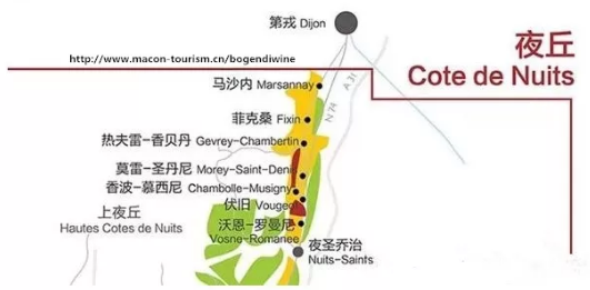 夜丘的特級(jí)園和一級(jí)園坐落在10個(gè)產(chǎn)酒村內(nèi),其中熱夫雷-香貝丹Gevrey-Chambertin、伏舊Vougeot、沃恩-羅曼尼Vosne-Romanee和夜圣喬治Nuits-Saint-Georges等村最為出名。