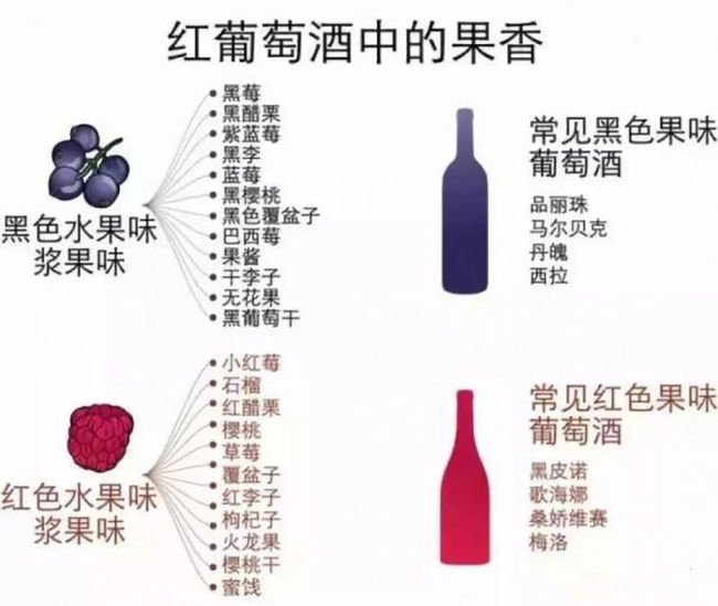 黑色水果的香氣常見于赤霞珠和西拉等葡萄酒,香甜中多了一分深邃,在最成熟的葡萄酒中會(huì)發(fā)展為果醬的香氣。