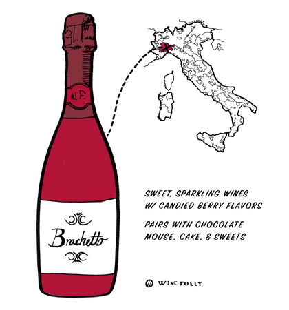 意大利出產(chǎn)的布拉凱多甜型起泡酒帶有玫瑰和清新的紅色水果香氣,口感清爽甜蜜,酒體輕盈,酒精度低,受歡迎程度堪比小甜水莫斯卡托阿斯蒂(Moscato d'Asti)。