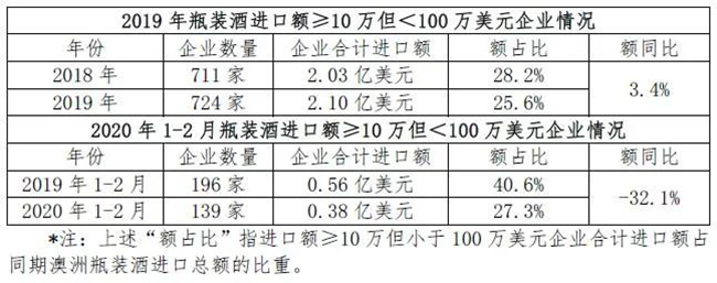 而因為抗沖擊能力弱,當遭遇疫情沖擊導(dǎo)致市場低迷的情況,部分小微企業(yè)或?qū)⒕痛送顺鑫枧_。以今年1-2月為例,進口澳洲瓶裝酒企業(yè)較同期減少的企業(yè)數(shù)量(130家)中絕大多數(shù)為小微企業(yè),但同時也有不少甚至更多的小微企業(yè)聞風而來“補位”。