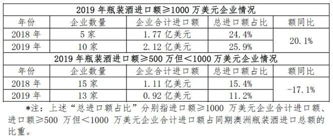 近兩年,頭部企業(yè)對澳洲酒的持續(xù)加碼對進口葡萄酒市場格局起到了頭雁效應(yīng)。澳洲瓶裝酒進口頭部企業(yè)(指進口額≥500萬美元以上的企業(yè))隊伍有所壯大,且進口額呈正向增長(5.6%):其中,2019年進口額≥1000萬美元的10家企業(yè)中9家實現(xiàn)同比增長,僅1家同比下降;進口額≥500萬美元的13家企業(yè)中9家實現(xiàn)同比增長,4家同比下降。