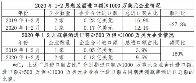 今年1-2月,盡管疫情對行業(yè)有一定沖擊,但澳洲瓶裝酒進口頭部企業(yè)基本穩(wěn)住陣腳。雖然進口額≥1000萬美元的企業(yè)僅1家,少于去年同期,但其進口額同比增長近30%;而進口額≥500萬但小于1000萬美元的企業(yè)有2家,數(shù)量增加,其中,1家進口額實現(xiàn)倍數(shù)增長,1家為新的行業(yè)進入者。