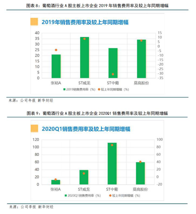 銷售費(fèi)用率水平一定程度上反應(yīng)了酒企在品牌和渠道建設(shè)上做出的努力。2019年四家葡萄酒企銷售費(fèi)用率高于20%,行業(yè)整體處于高位水平,這也在一定程度上反應(yīng)出葡萄酒市場競爭更加激烈。其中,ST威龍表現(xiàn)最突出,2019年銷售費(fèi)用率達(dá)36.4%,較上年同期增幅8.45%,其年報解釋稱主要是報告期內(nèi)促銷費(fèi)增加所致。