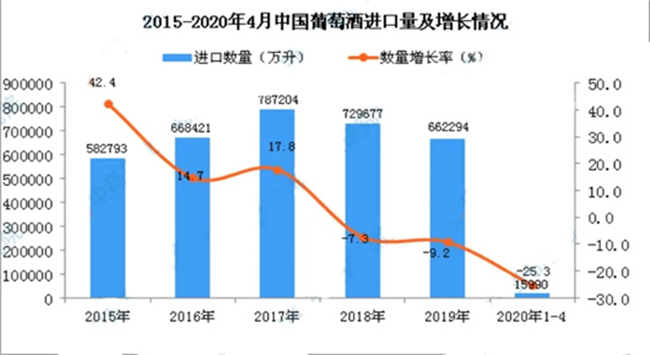 近日,中國海關(guān)發(fā)布相關(guān)數(shù)據(jù)顯示:2020年1-4月中國葡萄酒進(jìn)口數(shù)量為15990萬升,相比上年同期減少了90513.6萬升,降幅為25.3%。