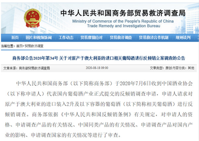 中華人民共和國商務部(以下簡稱商務部)于2020年7月6日收到中國酒業(yè)協(xié)會(以下稱申請人)代表國內葡萄酒產業(yè)正式提交的反傾銷調查申請,申請人請求對原產于澳大利亞的進口裝入2升及以下容器的葡萄酒(以下簡稱相關葡萄酒)進行反傾銷調查。