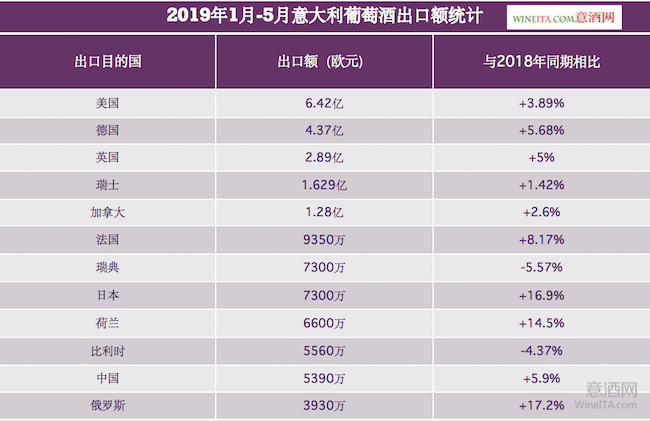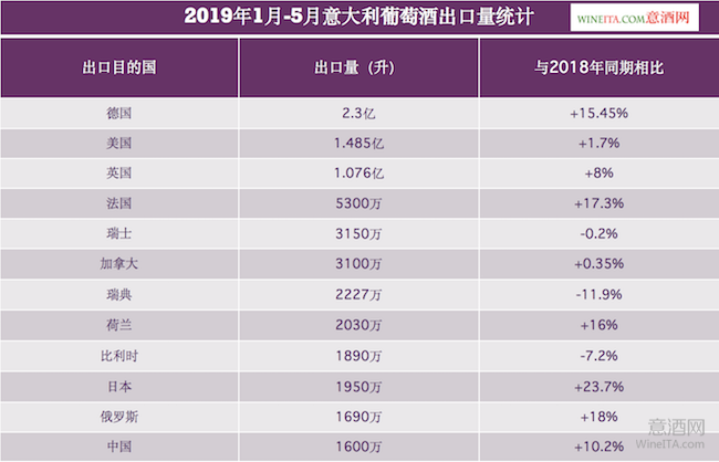 從出口量來看,2019年前5個月,意大利葡萄酒對德國的出口量最大,達(dá)到2.3億升,較2018年同期增加了15.45%。對美國的出口量為1.485億升,較上一年同期增加了1.7%;對英國的出口量為1.076億升,較上一年同期增加了8%。