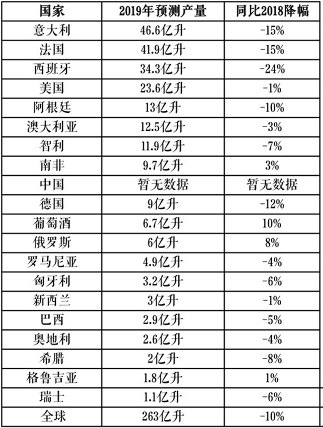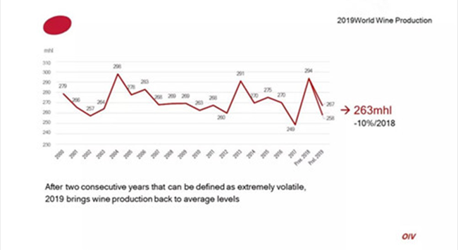 據(jù)國際葡萄與葡萄酒組織(OIV)最新數(shù)據(jù)顯示,2019年全球葡萄酒產(chǎn)量為263億升(mhl),同比2018年下降了10.54%。