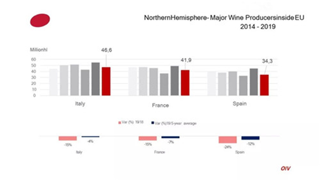 包括法國、意大利、西班牙在內(nèi)的葡萄酒主產(chǎn)國產(chǎn)量均有不同程度下降。OIV的數(shù)據(jù)來自28個國家,占全球葡萄酒產(chǎn)量的85%。