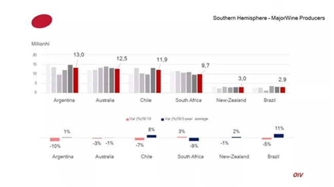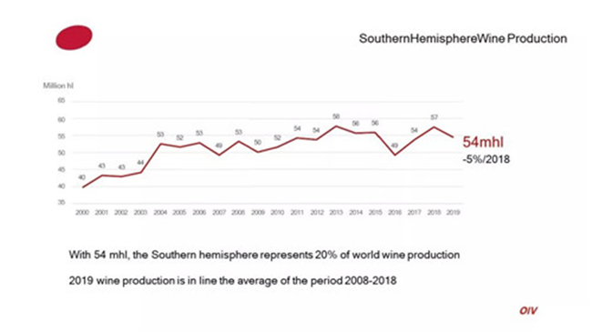 南半球2019年葡萄酒產(chǎn)量為54億升(mhl),占據(jù)全球葡萄酒產(chǎn)量的20%,與2008-2018年平均產(chǎn)量持平。