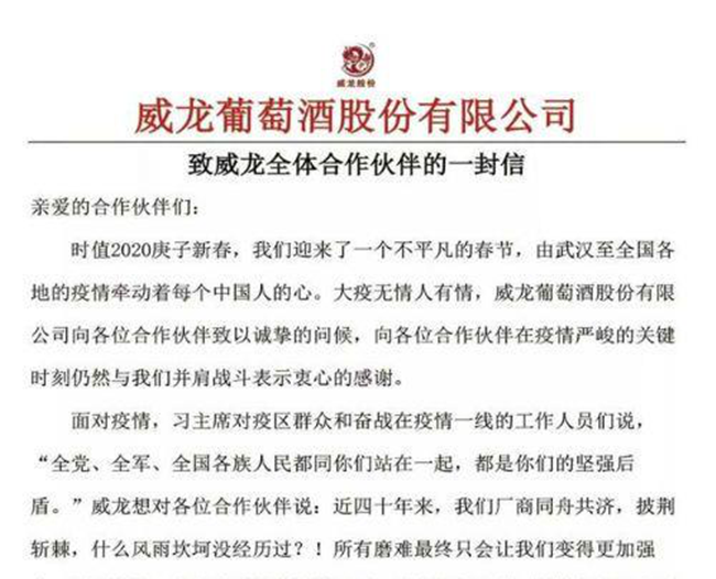 在威龍葡萄酒發(fā)布的公開信中能看到,企業(yè)正試圖通過“攜手并肩,共渡時艱”這樣的積極話語來增強(qiáng)與合作伙伴之間的聯(lián)系。記者從威龍葡萄酒方面進(jìn)一步了解到,除了在公開信中表達(dá)的正面語言,企業(yè)還提出了具體的“渡過時艱”舉措,例如陸續(xù)恢復(fù)物流配送以保障合作伙伴的訂單發(fā)貨需求、強(qiáng)化疫情管控等。
